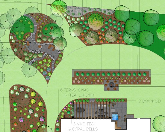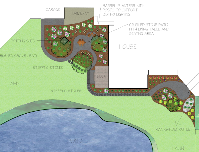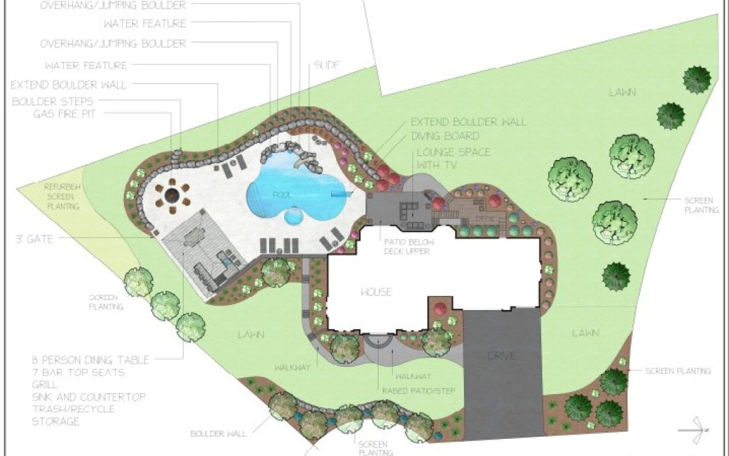 Example – Site Design over one or more larger adjacent areas – Design may feature suggestions for lighting, drainage, hardscape, pool/water garden design, etc., but will not include additional technical design plans.